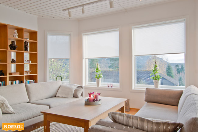 Du kan også matche et mønster eller en farge du har i lamellgardinen eller din plissé – en rød trå tvers gjennom ditt hjem – helt etter din smak. Velg mellom klassisk fjærbetjening, eller et endeløst kjedetrekk som stopper rullegardinen på eksakt samme sted – hver gang. En minimalistisk bunnlist i aluminium gir produktet en dekorativ avslutning. Florlett, perforert eller mørkleggende – med Norsol Rullegardiner tilføres rommet den skjerming det fortjener.